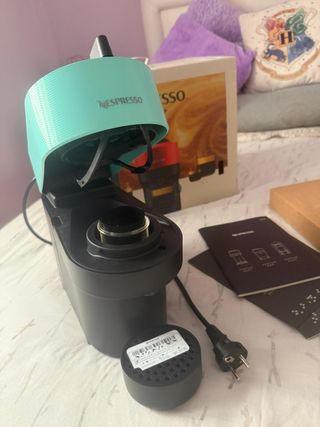 Cafetera Nespresso Virtuo de color turquesa. Puedo decir que es nuevo - Diseño moderno y compacto. - Incluye cápsula de café Para poder utilizar los primeros días yo simplemente he utilizado para probar está impoluto........