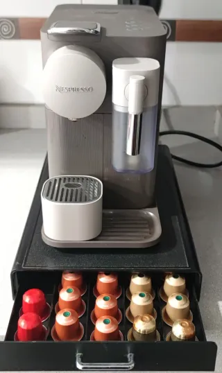 Cafetera DeLonghi Lattissima One en color marrón y blanco. Además regalo cajón inferior para el depósito de las cápsulas. Está en perfecto estado. - Depósito de leche extraíble. - Sistema de calentamiento rápido.