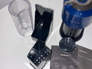 Cafetera Nespresso Vertuo en color azul. Incluye accesorios y manuales. - Depósito de agua. - Recipiente para cápsulas usadas. - Manual de seguridad.
