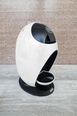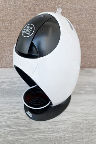 Cafetera de cápsulas Dolce Gusto en color blanco y negro. Diseño moderno y compacto. - Acabado brillante. - Base antideslizante. - Bandeja recogegotas. - Marca: DeLonghi.