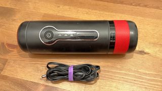 Cafetera portátil para capsulas ideal para usar en coches o camper (12v). - Diseño cilíndrico en color negro. - Banda de agarre texturizada en color rojo. - Botón de encendido/apagado. - Indicadores LED. - Incluye cable de alimentación.
