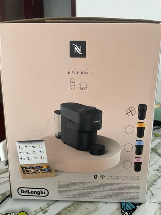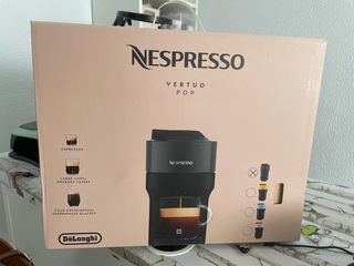 Cafetera Nespresso Vertuo Pop en color negro, de la marca DeLonghi. Permite preparar espressos, tazas grandes y bebidas frías. - Diseño moderno y compacto. - Compatible con cápsulas Vertuo. - Fácil de usar y limpiar. Totalmente nueva, sin uso