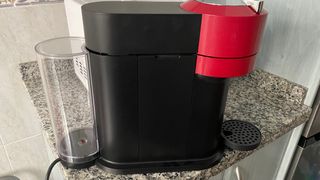 Cafetera Nespresso Vertuo en color rojo y negro. Diseñada para preparar café de forma rápida y sencilla. - Depósito de agua transparente. - Bandeja recogegotas ajustable. - Apto Cápsulas Vertuo