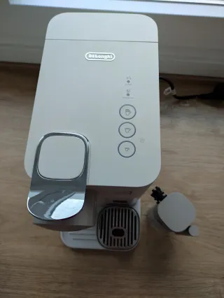 Cafetera de cápsulas Nespresso De'Longhi. Modelo One EN510.W, 1450W, 19bar, depósito agua 1 l, depósito y espumador leche integrado, Apagado automático, Blanco. En ocasiones se enciente el piloto de "descalcificar" aunque la cafetera haya sido descalcificada. Es más un indicador, ya que el café sale perfectamente y bien de sabor. Precio en tienda oficial: 289€!!