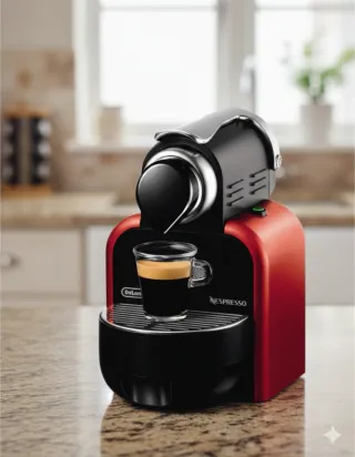 Cafetera de cápsulas Nespresso en color rojo y negro. Compacta y elegante, ideal para preparar tu café favorito. - Diseño moderno. - Depósito de agua transparente.