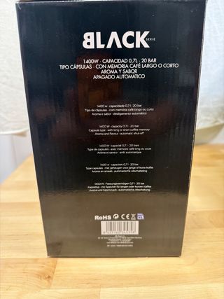 Cafetera de cápsulas Küken modelo BLACK. - Potencia de 1400W. - Capacidad de 0,7L. - Bomba de 20 bares. - Diseño moderno en color negro.