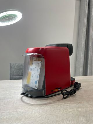 Cafetera de cápsulas Delta Q, modelo Mini. - Diseño compacto y moderno. - Color rojo y negro. - Incluye cable de alimentación.