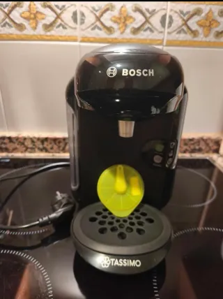 Cafetera Tassimo de la marca Bosch. Diseño moderno en color negro. - Compartimento para cápsulas. - Bandeja extraíble. - Incluye cápsulas Tassimo. - Se vende en mano en León.