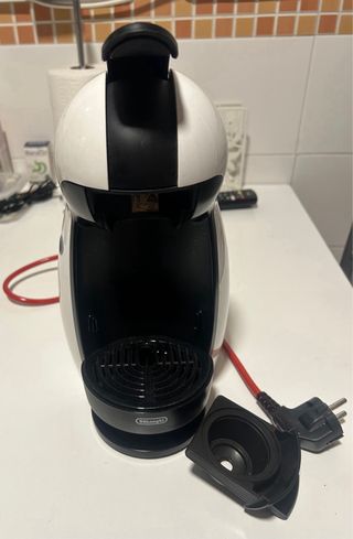 Cafetera de cápsulas Dolce Gusto en color blanco y negro. Ideal para preparar café y otras bebidas. - Diseño compacto. - Marca DeLonghi. - Incluye porta-cápsulas como se aprecia en la foto.