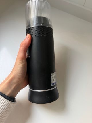 Cafetera eléctrica portátil. Café recién hecho en cualquier lugar: oficina, coche, viajes. Compatible con cápsulas y café molido - Cuerpo principal en color negro mate. - Tapa superior transparente con textura acanalada. - Puerto de carga USB-C. - Botón de encendido/apagado con indicador luminoso.