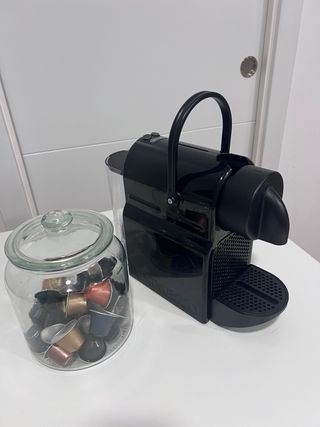 Cafetera Nespresso en color negro, DeLonghi con cápsulas y frasco cristal de regalo.