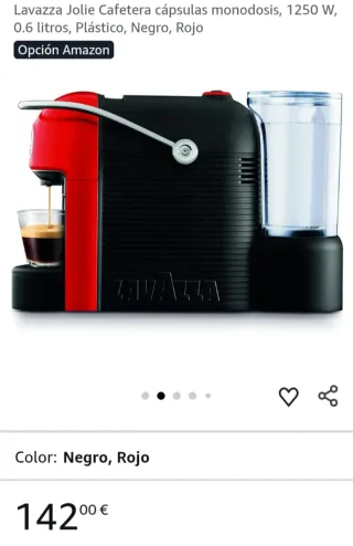 ¡La cafetera está nueva pero depósito está roto! Lavazza Jolie Cafetera cápsulas monodosis, 1250 W, 0.6 litros, Plástico, Negro, Rojo Marca Lavazza Color Negro, Rojo Dimensiones del producto 10f. x 10an. x 10al. centímetros Función especial Apagado automático, Bandeja de goteo extraible, Capacidad de reservorio de agua (0,6 L), Depósito extraíble, Indicador de nivel de agua, Interruptor de encendido/apagado integradoApagado automático, Bandeja de goteo extraible, Capacidad de reservorio de agua Tipo de cafeteraCafetera de espresso MaterialPlástico