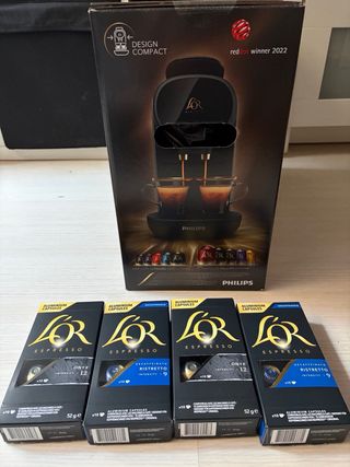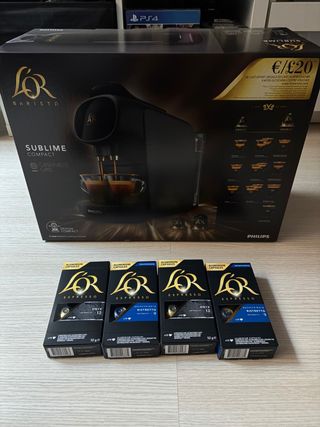 Cafetera L'OR BARISTA SUBLIME en color negro y gris cashmere. Diseñada para un café excepcional. Totalmente precintada sin abrir. Incluye 40 capsulas , cajas sin abrir - Modelo Sublime Compact. - Sistema de café de 19 bares. - Incluye 4 cajas de cápsulas L'OR Espresso (Onyx 12, Ristretto 9).