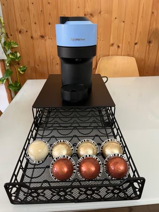 Cafetera de cápsulas Nespresso Vertuo en color azul y negro. Incluye un soporte para cápsulas. - Diseño moderno y compacto. - Soporte para cápsulas con capacidad para varias cápsulas.