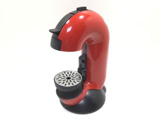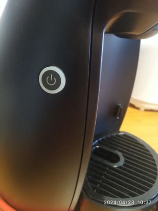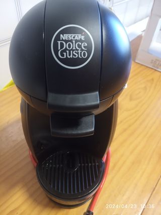 Cafetera Dolce Gusto de la marca Delonghi en color negro y rojo. El portacapsulas tiene las piezas separadas y hace que las cápsulas no queden bien fijadas a veces, de ahí el precio. No da ningún problema más