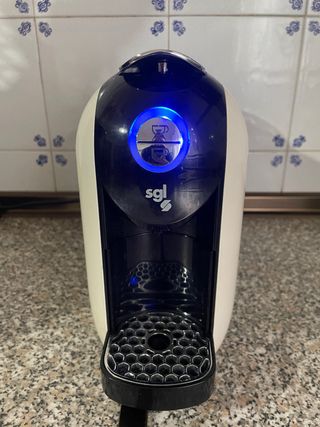 Cafetera de cápsulas SGL con un diseño moderno y compacto. - Color blanco y azul. - Indicador luminoso.