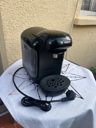 Cafetera de cápsulas Bosch en color negro. Diseño moderno y compacto, ideal para tu cocina. - Depósito de agua extraíble. - Bandeja recogegotas. - Cable de alimentación incluido. Tuvo muy poco uso.