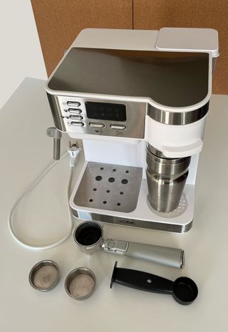 Cafetera Kotlie con diseño moderno y compacto, ideal para preparar tu café favorito. Incluye varios accesorios para diferentes 5 tipos de cápsulas. Valorada en 150 euros nueva - Diseño blanco y negro. - Depósito de agua extraíble. - Bandeja de goteo ajustable. - Incluye adaptadores para cápsulas.