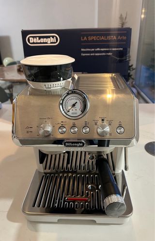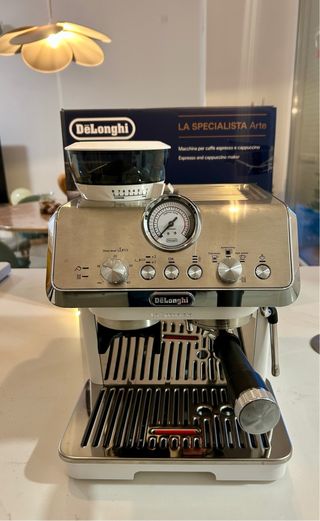 Cafetera DeLonghi La Specialista Arte en color beige y plateado. Diseñada para preparar café espresso y capuchino. - Incluye molinillo integrado. - Panel de control con dial y botones. - Manómetro para control de presión. - Bandeja de goteo extraíble.