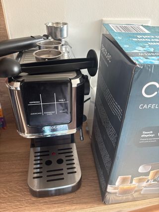 Cafetera Minimoka automática de color crema. - Diseño compacto y elegante. - Panel de control con iconos. - Bandeja de goteo extraíble.Va pero sale agua alrededor donde sale el café no tiene brazo