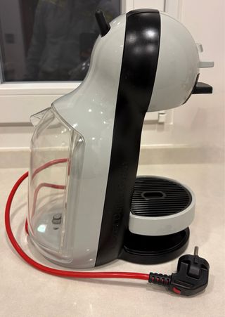 Cafetera de cápsulas Dolce Gusto con un diseño moderno en blanco y negro. Perfecta para preparar tu café favorito. - Depósito de agua transparente. - Cable de alimentación rojo.