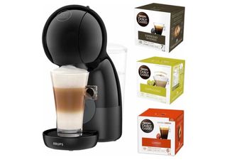 Cafetera Krups Dolce Gusto Piccolo XS en color negro. Incluye tres cajas de cápsulas: - Espresso Intenso (7 cápsulas) - Cappuccino (6 cápsulas) - Lungo (6 cápsulas)