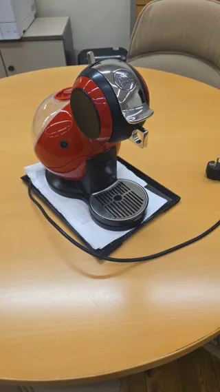 Cafetera de cápsulas Dolce Gusto en color rojo. Diseño moderno y compacto. - Depósito de agua transparente. - Palanca superior para apertura. - Salen buenos cafés e infusiones. - A veces se le sale un poco de agua por abajo. - Altura unos 36 cm