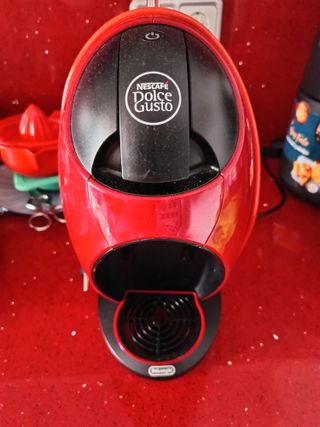 Cafetera Nescafé Dolce Gusto en color rojo. - Diseño compacto y moderno. - Marca Nescafé Dolce Gusto. - Base con logo DeLonghi.