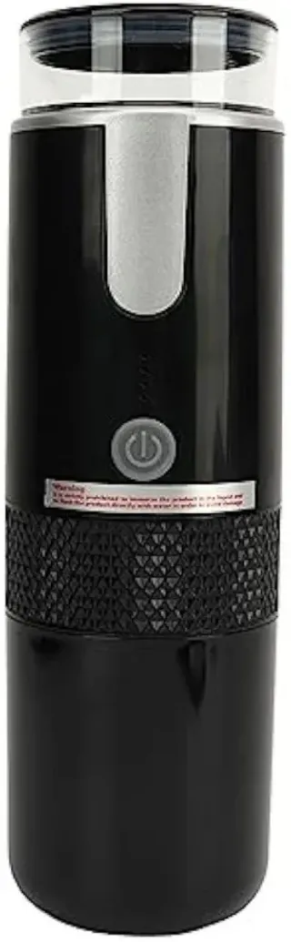 Cafetera eléctrica portátil de color negro, ideal para preparar café sobre la marcha. Incluye accesorios para su uso. - Diseño cilíndrico y compacto. - Tapa superior translúcida. - Botón de encendido/apagado. - Puerto de carga USB. - Cuchara medidora incluida.