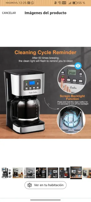 Cafetera eléctrica de acero inoxidable y negro. - Función de recordatorio de ciclo de limpieza. - Pantalla con retroiluminación. - Jarra de vidrio.