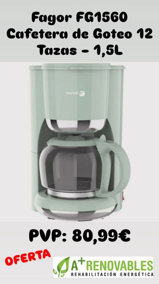 Cafetera de goteo Fagor FG1560 en color verde menta. Tiene una capacidad de 1,5 litros y es apta para 12 tazas. - Marca: Fagor - Modelo: FG1560 - Tipo: Cafetera de goteo - Capacidad: 1,5L (12 tazas) - Color: Verde menta Disfruta del mejor café con la cafetera de goteo Fagor FG1560 1,5L. Prepara hasta 12 tazas con su potente sistema de 1080W, jarra de cristal resistente y sistema de filtro fácil de limpiar. Ideal para amantes del café en casa o en el trabajo. #cafeteradegoteo #APlusRenovables #cafeterafagor #TuUltimoClic #cafeteraelectrica