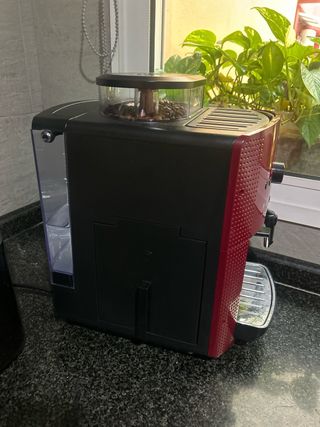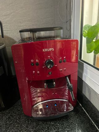 Cafetera superautomática Krups en color rojo. Diseñada para preparar café de forma rápida y sencilla. - Depósito de granos de café. - Panel de control digital. - Vaporizador para leche. Funciona perfectamente y tiene todos los accesorios. Puedo mandar video del funcionamiento