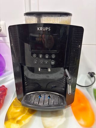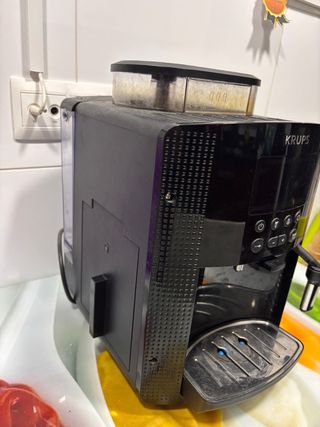 Cafetera superautomática Krups de color negro. (Actualmente pierde agua, necesita reparación) - Depósito de agua transparente de 1.7L - Compartimento superior para granos de café de 260gr. - Pantalla LCD - 3 niveles de temperatura + 3 texturas de molido - Boquilla de vapor para cappuccino