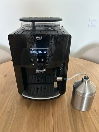Cafetera de la marca Krups. - Diseño moderno en color negro. - Dos portafiltros. - Panel de control con indicadores luminosos. - Espumadur de leche Cafetera con muy poco uso adjunto ticket de compra.
