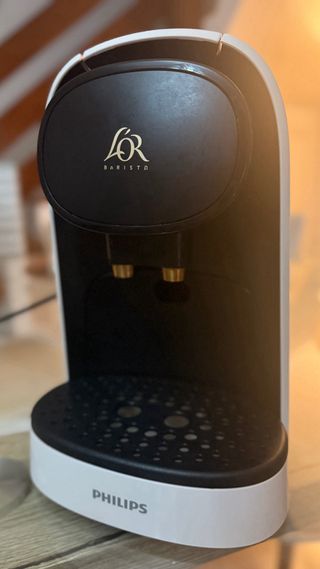 Cafetera de cápsulas L'OR Barista de Philips en color blanco y negro. Diseñada para preparar café de forma rápida y sencilla. - Diseño elegante y compacto. - Bandeja recogegotas extraíble. - Compatible con cápsulas L'OR y Nespresso. - 19 bar presión - Depósito de 1,2 litros Perfecto estado, sin caja. En garantía.