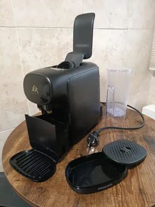 Cafetera de cápsulas LOR BARISTA de Philips. Diseño moderno en color negro. - Bandeja recogegotas. - Salida de café. - Marca LOR BARISTA. Estado: perfecta Modelo: Sublime Compact Compatible con cápsulas L'OR, Nespresso y doble cápsula XXL Diseño compacto y elegante, ideal para cualquier cocina Café de alta presión para un sabor intenso Incluye cápsulas de regalo