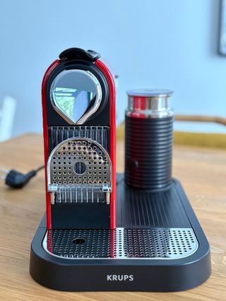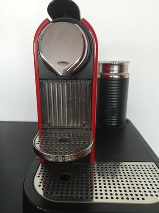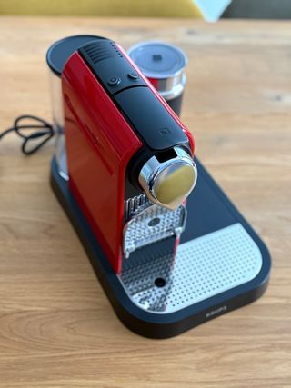 Cafetera Nespresso Krups Citiz en color rojo y negro. Incluye el espumador de leche Aeroccino. - Diseño moderno y compacto. - Base con rejilla extraíble. La única parte más desgastada es la parte interior de la bandeja (no visible). Todo se aprecia tal y como está en las fotos.