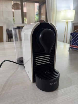 Cafetera de cápsulas Nespresso de la marca Krups. Diseño moderno en color blanco y negro. Con muy poco uso. Funciona a la perfección. - Parte superior blanca con líneas horizontales. - Base y depósito en color negro. - Bandeja de goteo extraíble.