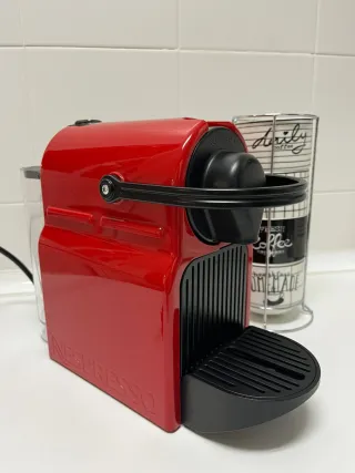 Cafetera Nespresso Krups de color rojo, con espumador de leche. - Diseño moderno y compacto. - Base con rejilla. - Marca: Krups.