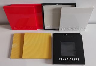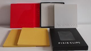 Conjunto de tapas laterales para la cafetera Nespresso Pixie. - Dos tapas de color rojo. - Dos tapas de color blanco. - Dos tapas de color amarillo. - Una caja de Pixie Clips negra.