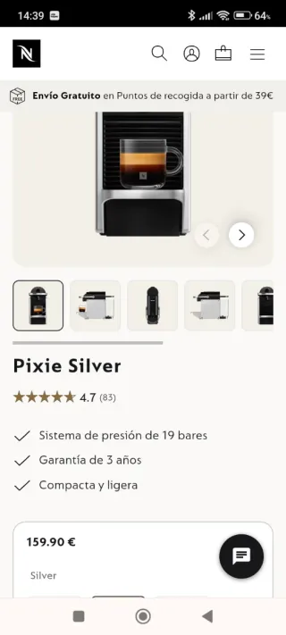 Cafetera Nespresso Pixie Silver en color plata. Un diseño elegante y compacto para tu hogar. - Sistema de presión de 19 bares. - Garantía de 3 años. - Compacta y ligera.