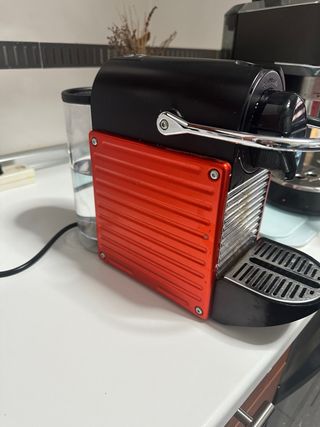 Cafetera Nespresso Pixie Krups en color rojo y negro para cápsulas. - Diseño moderno y compacto. - Paneles laterales metálicos de. aspecto martillado. - Asa de acero pulido. - Depósito de agua extraible. - Programable café espresso/lungo. - Auto apagado. - Bandeja recogegotas abatible. - 19 bares En perfecto estado estético y de funcionamiento. Muy poco uso.