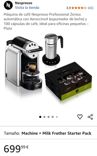 Cafetera Nespresso Zenius en color negro y plateado, con depósito de agua adicional y 250 cápsulas. Incluye todo lo siguiente: - Cafetera Nespresso Zenius. - Depósito de agua extra. - 250 cápsulas de café. Ideal para oficina o para disfrutar de café de alta calidad en casa. Funciona perfectamente, es rápida, robusta y muy fácil de usar. Café con calidad profesional Calentamiento rápido Uso sencillo y mantenimiento fácil Diseño elegante y resistente 📦 Se entrega el pack completo, listo para usar desde el primer día. 💬 Para cualquier consulta, escríbirme