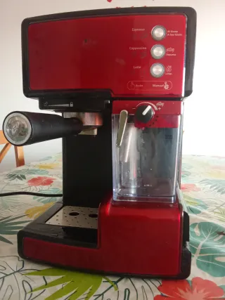 Cafetera espresso de 15 bar. Recien descalcificada. Hace un cafe muy bueno. La bomba de la leche suena pero no saca la leche (no la he usado practicamente nunca), la probe para venderla y no se que es lo que le pasa. Perfecto funcionamiento de la bomba de la cafetera.