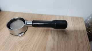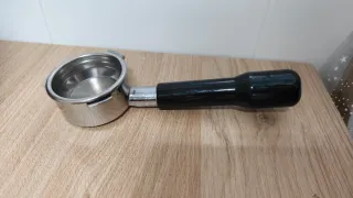 Portafiltro sin fondo para máquinas de espresso. Poco uso, por qué no logré que me salieran bien. - Diámetro de 58mm y 3 orejas. - Válido para cafeteras como Barsetto, Breville, Sage, Oster, Duchess, HiBrew, Gevi. - Fabricado en acero inoxidable y mango negro.