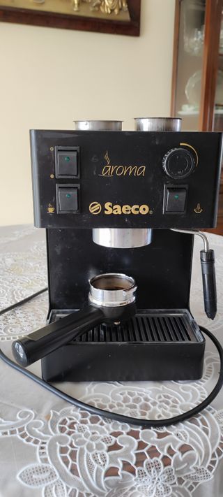 Cafetera espresso manual Saeco Poemia de color negro y detalles plateados. necesita limpieza interior profunda por eso tiene este precio vendo porque ya tengo otra cafetera incluye maneta presuriazada no original de la cafetera pero de la marca gaggia. la maneta ya cuesta lo que te cuesta la cafetera entera
