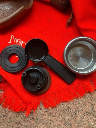 Piezas de repuesto para cafetera Mercurio Taurus. Incluye la bandeja de goteo y el portafiltro. - Bandeja de goteo de metal con ranuras. - Portafiltro de metal.
