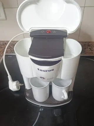 Cafetera Taurus Duetto en buen estado, ideal para preparar café para dos personas. - Diseño compacto y moderno. - Incluye dos tazas blancas. - Marca: Taurus.