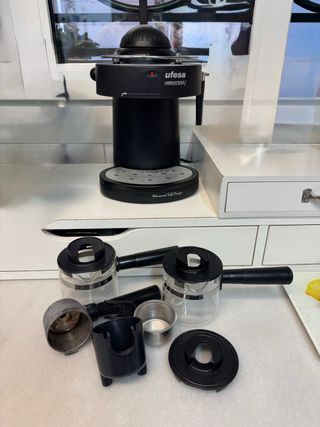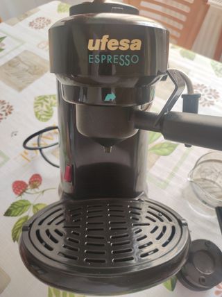 Cafetera Ufesa en perfecto estado para preparar espressos y capuchinos en casa. Incluye varios accesorios para un uso completo. - Cafetera Ufesa. - Portafiltros. - Tamper. - Jarrita para leche. - Vaporizador. - Accesorios para café molido. - Depósito para posos café con superficie para golpear el portafiltros - Dos filtros, de 1 taza y de 2 tazas - Mezclador de café molido - 2 jarritas para leche, una de Acero inoxidable y otra de Porcelana - Espumador de leche Opción de añadir molinillo café Bosch Delonghi Krups Philips Saeco nesspreso melitta cecotec