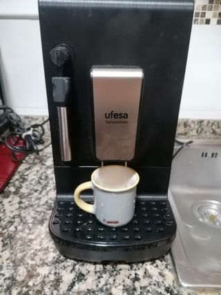 Cafetera Ufesa Sensazione en color negro. - Panel de control con iconos táctiles. - Indicadores luminosos para funciones. - Diseño moderno y compacto. La cafetera funciona no tiene alarmas , le falta el deposito y la bandeja. Para alguien que tenga una averiada o tenga repuestos